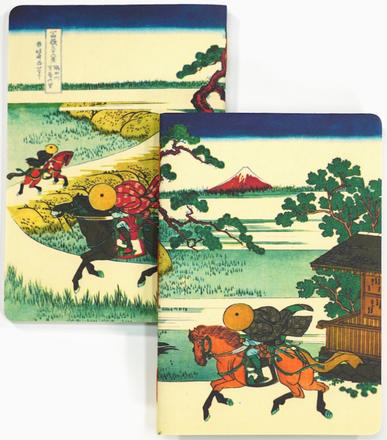 A total of 75 of these 3.5 by 5.5 inch pocket notebooks were hand made by Enon Avital in a 2024 Kickstarter collaboration. The cloth cover shows the Hokusai print from the 1830’s of the postal riders on horseback and Mt. Fuji in the distance. The price includes shipping to United States addresses only. One per person please.